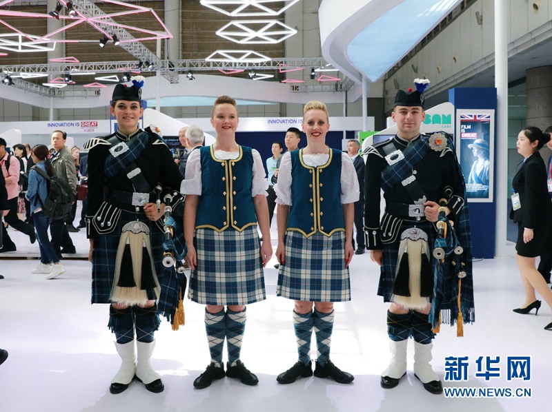 5月11日,第三届丝绸之路国际博览会暨中国东西部合作与投资贸易洽谈会在西安开幕。图为丝博会英国展区,参展商身着英国传统服饰。新华网发 巩阳 摄